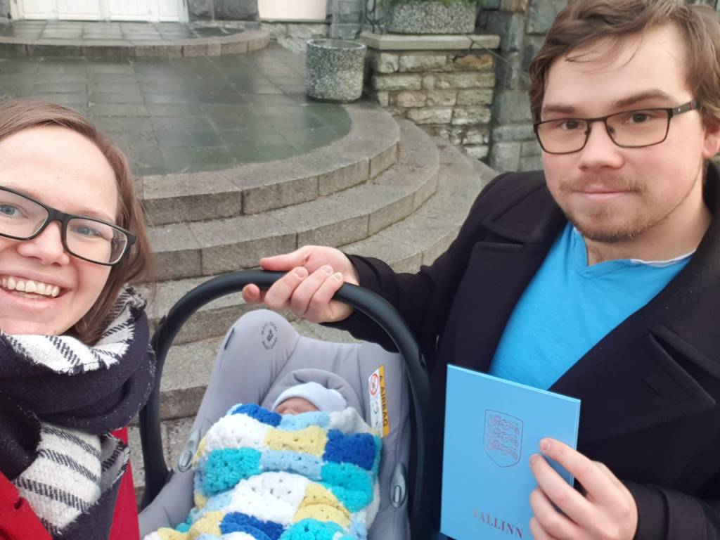Ma tõesti ei olnud sellele mõelnud, kuidas see päriselt välja näeb. Sünd tuleb registreerida ja lapsele on vaja nimi panna. Juhul kui oled lapse isaga abielus, saab seda kõike läbi neti teha. Meie Jüriga abielus ei ole, seega tuli meil minna õnnepaleesse, kus Jüri muuhulgas võttis ka isaduse omaks. 16.detsembril registreerisime sünni, panime nime ning maja ees tegin meist kolmest ka esimese ühise foto.