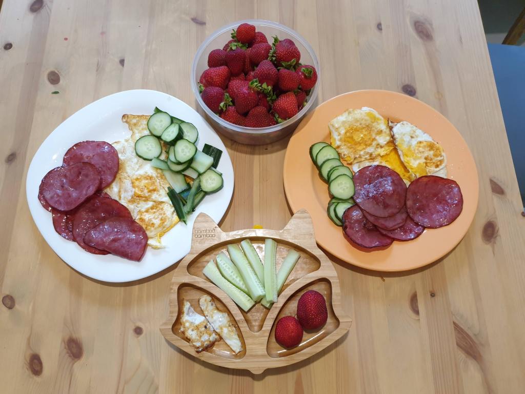 Kui meie sööme praemuna ja kodujuustu, siis anname Georg Martinile maitsestamata praemuna (piklike viilukestena) ja kooritud kurgikange, et ta saaks süüa enam vähem sama, mida meiegi. Lehmapiimatooteid alguses väga ei soovitata seega kodujuustu ma talle ei anna. Küll aga kui me oleme laisad ja tellime pitsa, siis Georg Martinile anname ikka juurikaid, kamapalle, apelsini, või midagi muud talle sobivat. See on see mida meie teeme. Tugevalt soovitatakse lapsele siiski anda alati sama, mida ülejäänud pere sööb ning beebi vajaduse järgi kohandatakse enda toidulaud veidi tervislikumaks, kuid me vahel ikka tahame pitsat ja burksi ning pojale me neid veel anda ei taha.