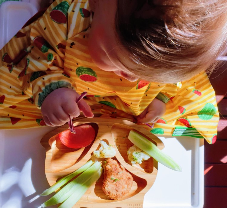 Juhul kui me teda vanni panna ei taha (kohe varsti aeg magama minna ning ei taha märja nahaga last õue viia), siis sööb ta põllega ning pesema tal peale söömist ära näo ja käed. - Põrandalt toit lihtsalt kätte